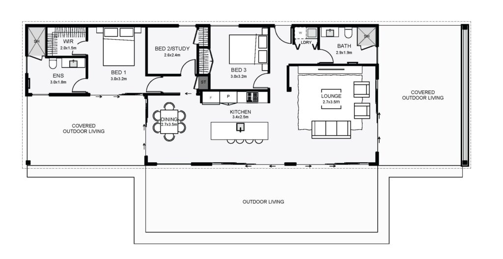 A seamless modern transportable that’s truly rectangle in shape and modern in flavour. Optional full-height glazing will help achieve good light inside and views out across your site. Inside, there are three bedrooms, a master with ensuite, and a spaced-out open plan living. If you have a wide site with a view, this transportable will be right at home!