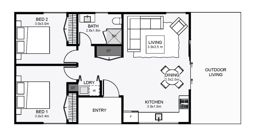 This classic, gable dwelling will look sharp wherever you place it. Inside, the bedrooms and living nearly appear as separate wings. The bathroom, laundry and covered entry void make this happen. Simple and timeless are two words that describe this home well.