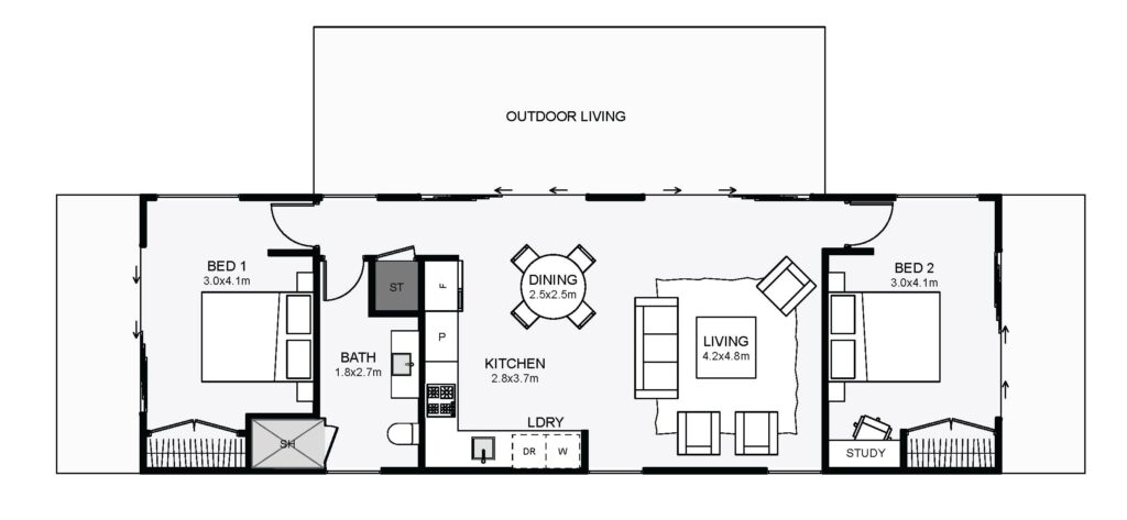 This small gable home is designed to make use of a wide north-facing outlook. Inside, all living is centred, between two bedrooms giving you full privacy. If your section has width, this dwelling will have you enjoying the view with some fabulous indoor/outdoor flow!